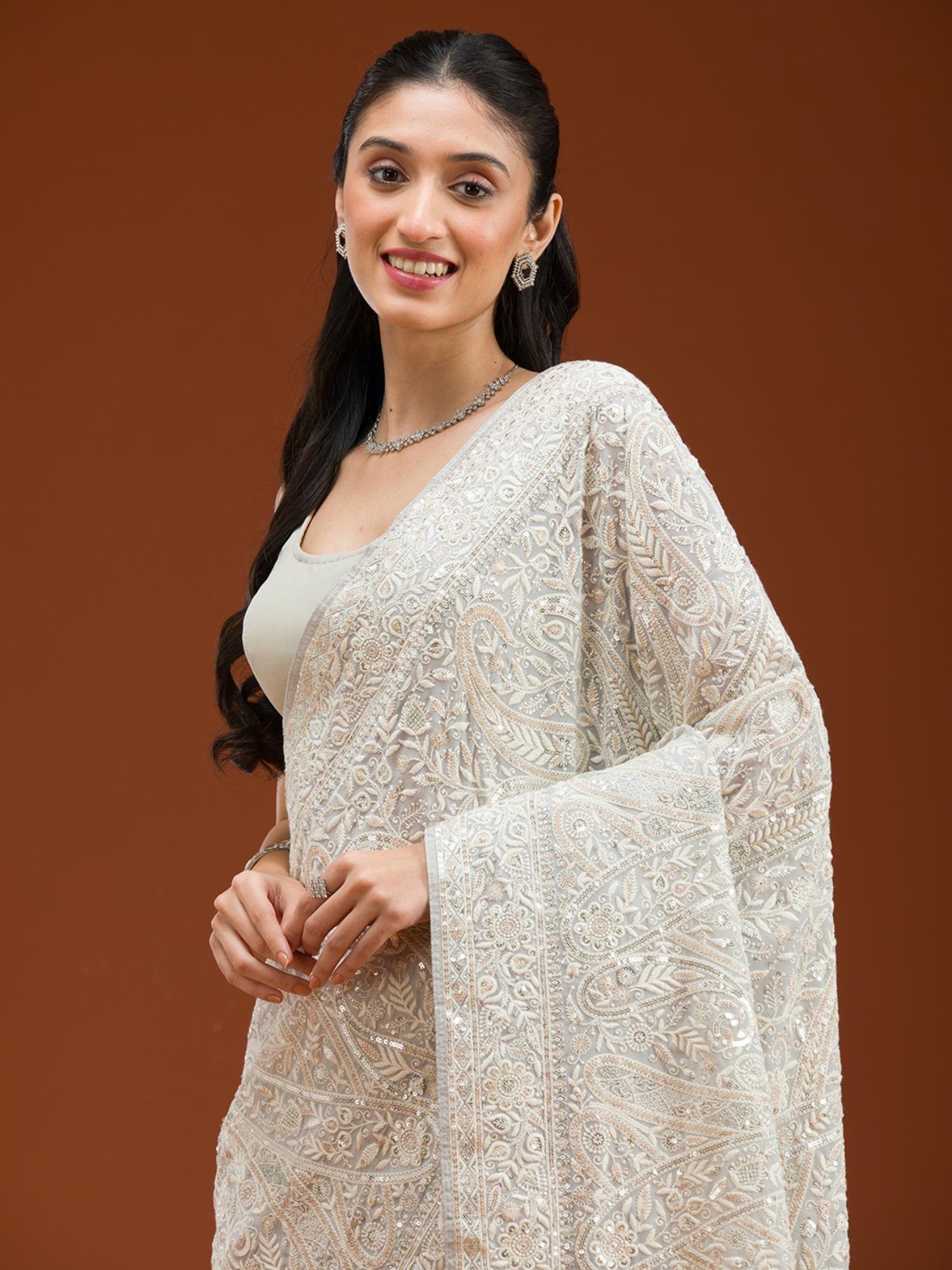 Grey Embroidered Saree with Unstitched Blouse