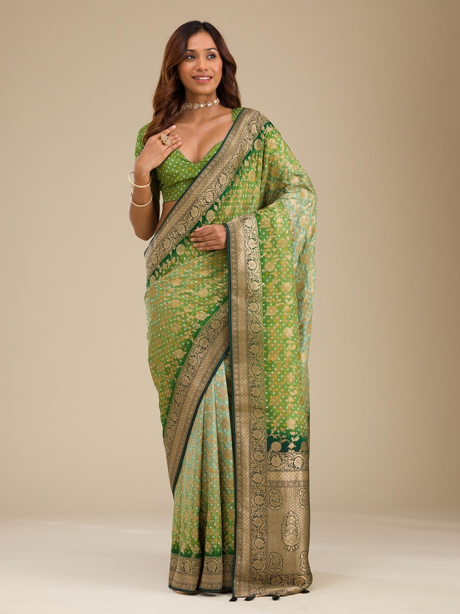 Leaf Green Zari Georgette Saree with Unstitched Blouse