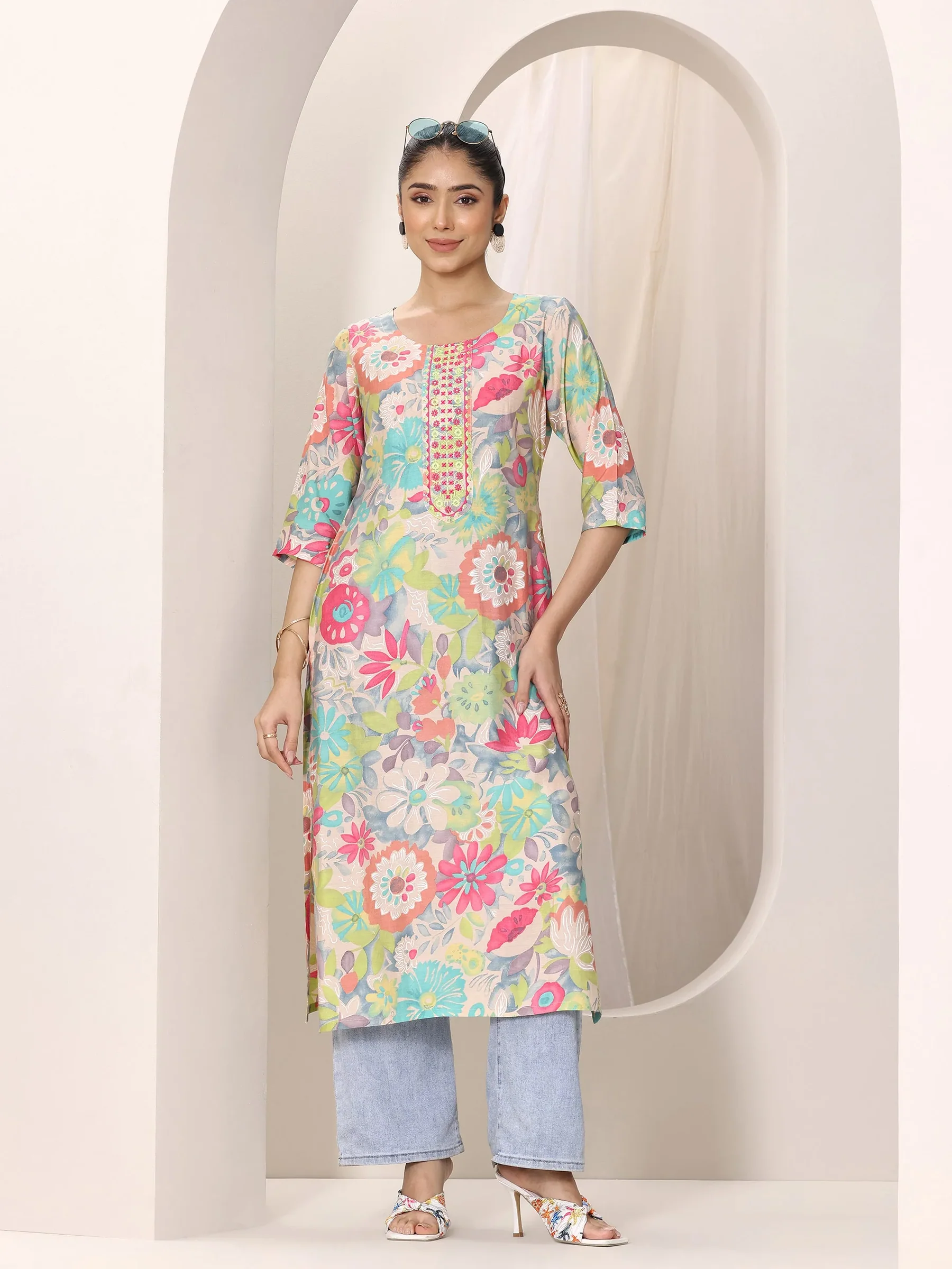 Multi Printed Silk Blend Straight Kurta