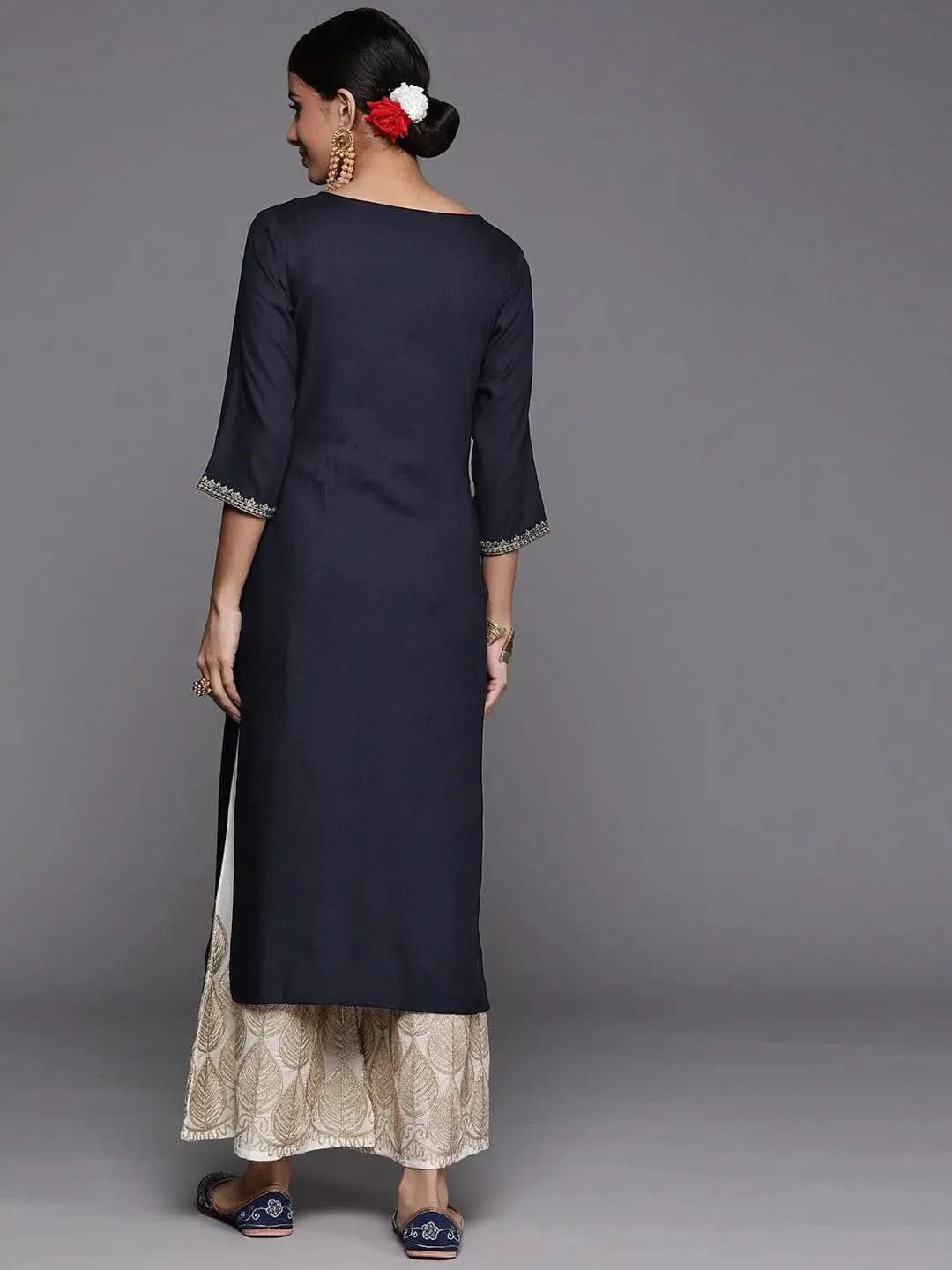 Navy Blue Yoke Design Rayon Straight Kurta