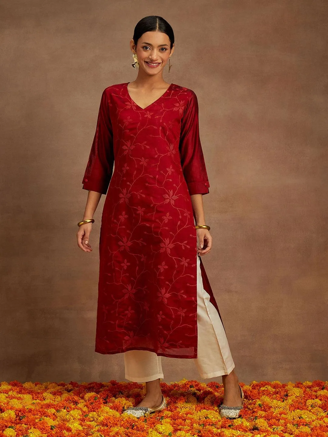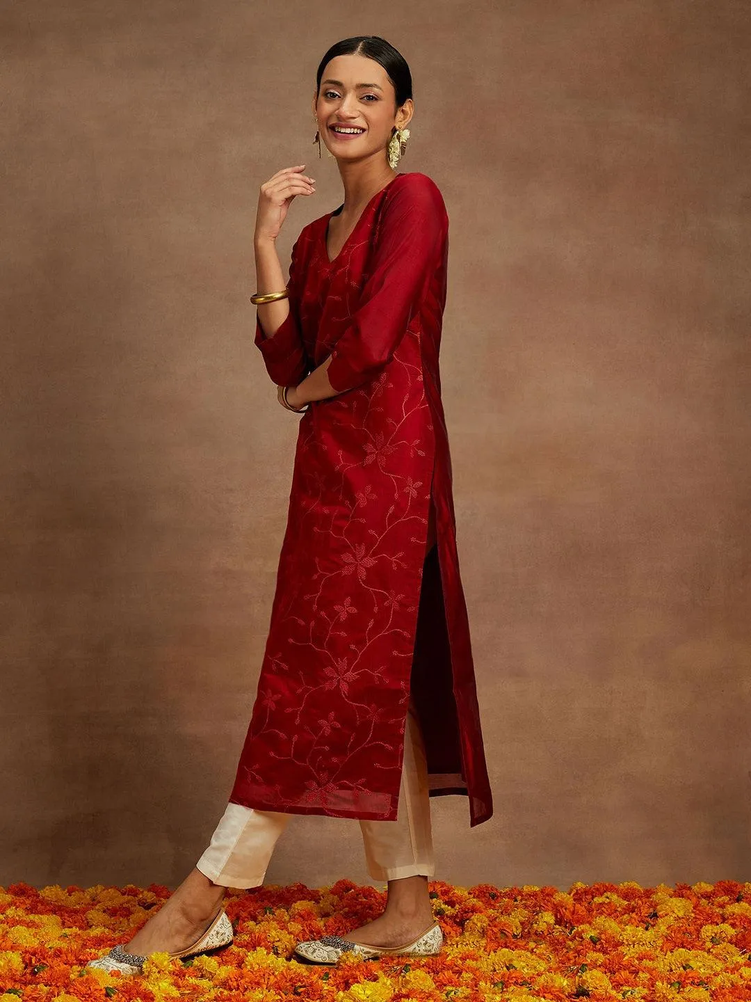 Red Embroidered Chanderi Silk Straight Kurta