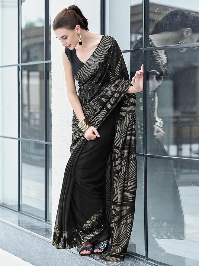 Women's Georgette Sequin Embroidery work Saree with Unstitch Blouse Piece
