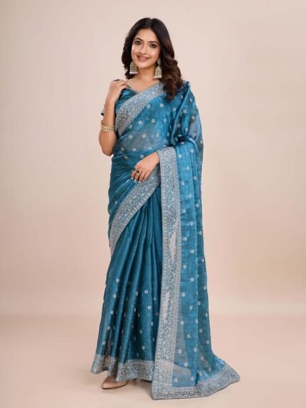 ₹5,440.00 Incl GST.Blue Kia Pre-Draped Saree with Stitched Blouse